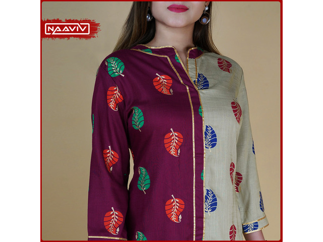 Filled with combination of rich hues of wine & beige to accelerate the style you own .A perfect choice if you are looking for style & elegance in a single go. The Kurti features a band collar and gold lace to adorn you with a stunning demeanor .A subtle choice to twin on any day , Club it with Slim Pant & stilettos to add a dash of grace to your persona .